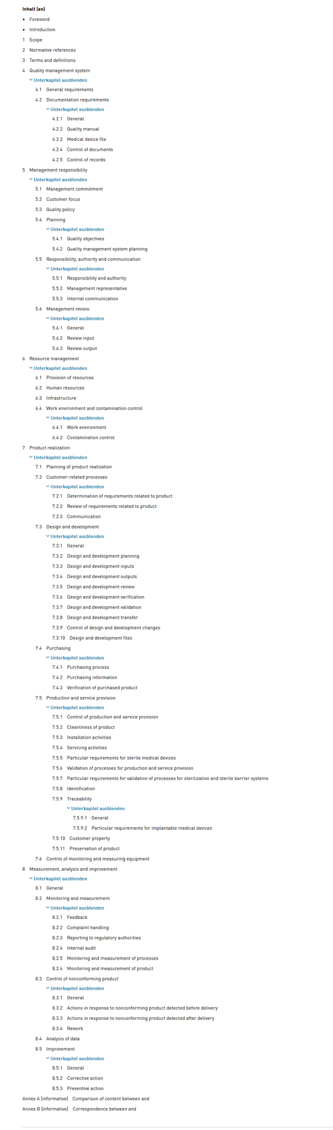 Inhaltsverzeichnis ISO 13485