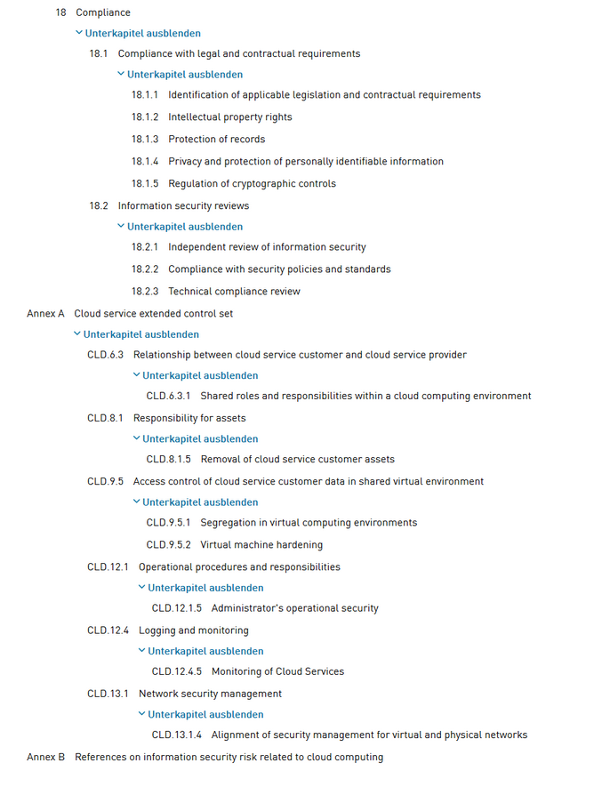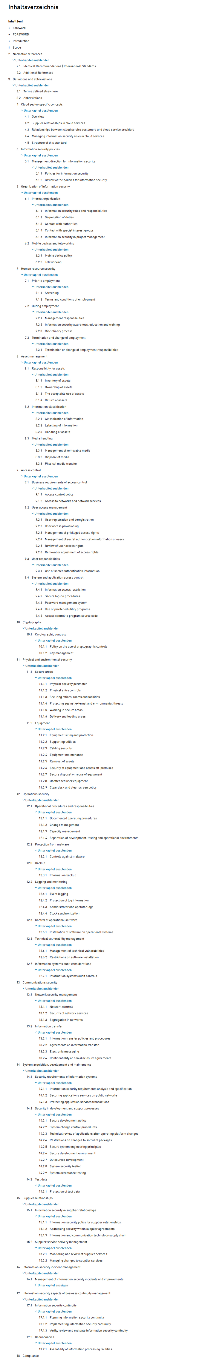 Inhaltsverzeichnis ISO 27017